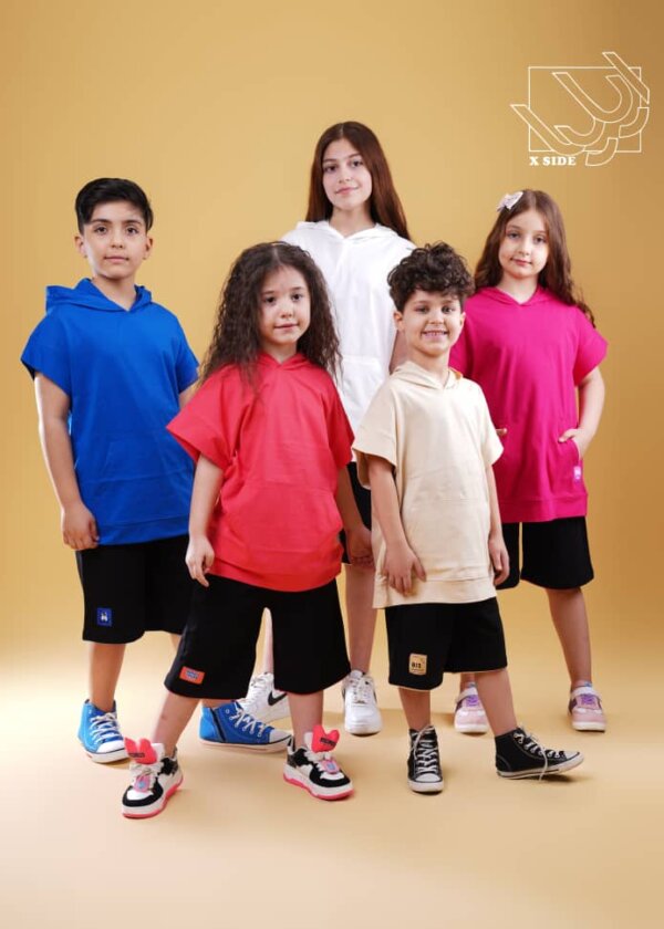 ست اسپورت هودی لوز جیب دار با شلوارک دخترانه و پسرانه بهاره